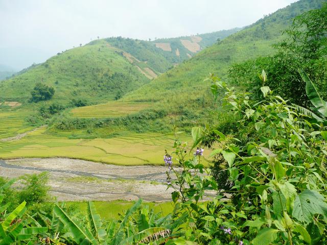 Am Morgen fliegen wir mit einer Propellermaschine von Typ ATR 72 der Vietnam Air in das Bergland Nordvietnams, nach Dien Bien Phu. Die Maschinen von Vietnam Air, wir flogen mit Airbussen A323 sowie ATRs 72, machen übrigens einen recht gepflegten Eindruck. Man fühlt sich sicher. Unser Zielgebiet befindet sich in einer recht abgelegenen Gegend im Muong Than-Tal, das von steilen und mit Vegetation überwucherten Bergen umgeben ist. Dien Bien Phu war Schauplatz der Schlacht, in der die Franzosen besiegt wurden und damit die Kontrolle als Kolonialmacht verloren. Wir besuchen den strategisch wichtigen und hart umkämpften Hügel A1 und sehen die Kampfspuren. Auf die umliegende Gegend gibt es von hier aus einen guten Überblick.