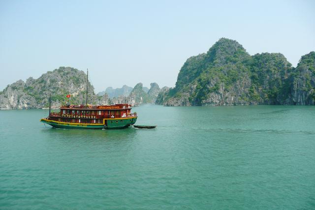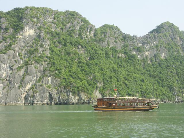 Wir haben ganz gut im Schlafabteil des Zuges übernachtet und sind in der Haupstadt angekommen. Wir fahren sofort mit dem Bus weiter zur grandiosen Inselwelt der Halongbucht, die zum UNESCO-Naturerbe zählt. Gegen Mittag schiffen wir auf einer traditionellen Bai-Tho-Dschunke ein. Auf dem Schiff werden wir auch übernachten. Die Kabinen sind für so eine Dschunke hervorragend ausgestattet. Sie haben sogar ein eigenes WC und eine Dusche. Die Halongbucht gehört zum Südchinesischen Meer. Wir fahren durch die Bucht. Der Anblick der tausenden aus dem Wasser ragenden wundersam geformten Kalksteinfelsen ist überwältigend und unbeschreiblich. Die Halongbucht war für mich der absolute Höhepunkt der Vietnamreise. Nach dem Besteigen eines Berges und Besichtigung einer Höhle am Ende der Bucht, nehmen wir noch ein Bad im Meer. Dann senkt sich die Sonne und hüllt die Halongbuch in Dunkelheit.