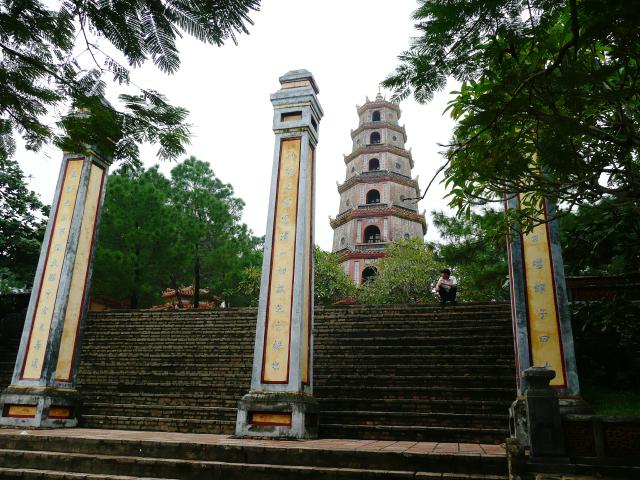 Von Dong Hoi fahren wir wieder auf einer Küstenstraße, entlang an Sanddünen und Stränden, zurück nach Hué. Unterwegs halten wir, um am Südchinesischen Meer einen echten vietnamesischen Kaffee zu trinken. Am frühen Nachmittag erreichen wir Hué und machen eine Bootsfahrt auf dem „Parfümfluss“ zur gut erhaltenen Thien-Mu-Pagode. Der Fluss heißt so, weil zu bestimmten Jahreszeiten wohlriechende Blüten von den Bäumen in den Fluss fallen und einen angenehmen Geruch verbreiten. Bei unserer Tour war er allerdings geruchlos.