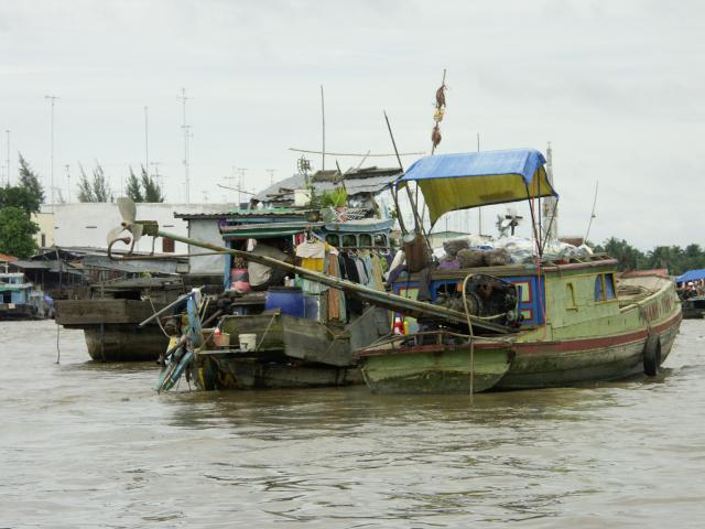 Mit unserem Boot besuchen wir auch einen schwimmenden Markt im Mekong-Delta. Jeder Händler hat an seinem Boot ein Msuter seiner Waren, z.B. eine Melone, befestigt. Dadurch können potenzielle Kunden erkennen, ob sie mal rüber rudern oder nicht.