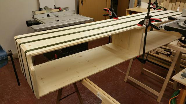 Die einzelnen Teile werden verleimt und wegen der großen Höhe des Regals mit Zurrgurten verspannt. Eigentlich sollte an den oberen Kanten ein Kantenschutz, wie z.B. Pappe, verwendet werden. Da ich dort aber ein rundliches Profil gefräst habe, habe ich mir den Aufwand gespart. Für den Bau der Regale habe ich übrigens Leimholz aus Fichte verwendet.