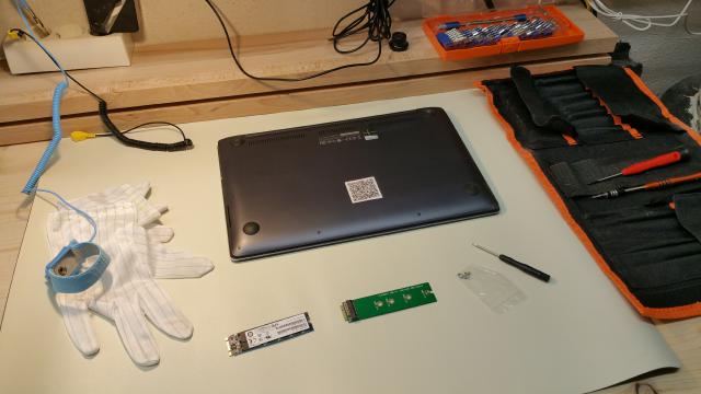 Von einem modernen ASUS-Ultrabook soll die vorhandene 256-GB-SSD gegen ein größeres Exemplar mit einer Kapazität von einem Terrabyte ersetzt werden. Die Suche nach einem Modell mit passender Bauform und Anschlussleiste gestaltete sich schwieriger als gedacht. Denn ASUS verbaute weder eine mSATA-SSD noch eine mit M.2-Bauform. Von der Baugröße wären diese Typen geeignet gewesen, aber die Anschlussleiste hätte nicht gepasst. ASUS verwendet hier ein exotisches Exemplar. Nach langer Recherche im Internet wurde dann doch noch ein speziell für dieses Ultrabook gefertigter Adapter für eine M.2-SSD gefunden. Mit diesem Adapter und einer M.2-SSD konnte der Tausch realisiert werden.